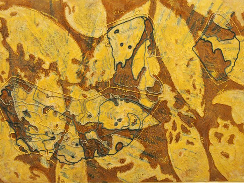 Raychel Steinbach is a Midwest American printmaker who investigates the convergence of landscape, storytelling, map, and personal interactions act as a way of creating work that reflects that uniqueness of place in a time when globalization is making our world increasingly placeless. During her time at ComPeung, she created a series of intimate mixed media prints about the journey between the point of departure and the destination, the geographical surroundings, and flora of ComPeung.  The work combines found objects as the printmaking matrix, embroidery to create line and depth, as well as traditional wood block techniques. Raychel explored layering maps, textures, and hand carved blocks on top of each other using very transparent inks, to create unexpected combinations while reacting to each layer as it develops.